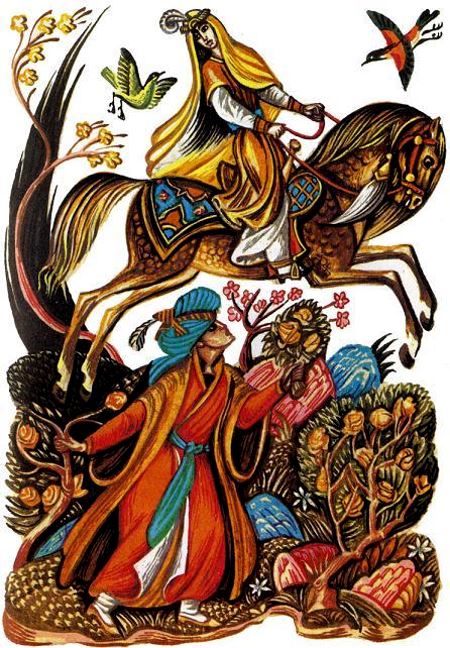 Надела девушка жёлтое платье, села верхом на солового жеребца и отправилась в сад с жёлтыми розами. А сын падишаха, как увидел прекрасную всадницу, влюбился в неё без памяти, нарвал букет жёлтых роз, протянул его девушке и стал молить её сойти с коня. Приняла девушка букет жёлтых роз и ускакала прочь.