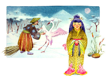 Испугались старик со старухой, открыли дверь и видят: никого нет. Лежит на полу прекрасная узорчатая ткань, а кругом журавлиные перья рассыпаны… Начали старики звать дочку, искали-искали, да так и не нашли.