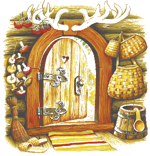 Дверь была отворена; она посмотрела в дверь, видит: в домике никого нет, и вошла.