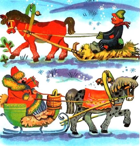 — Мне бы лучше за мужичком погнаться. Его скорей дойму: полушубок старый, заплатанный, шапка вся в дырах, на ногах, кроме лаптишек, — ничего. Он же, никак, дрова рубить едет… А уж ты, братец, как посильнее меня, за барином беги. Видишь, на нём шуба медвежья, шапка лисья, сапоги волчьи. Где уж мне с ним! Не совладаю.