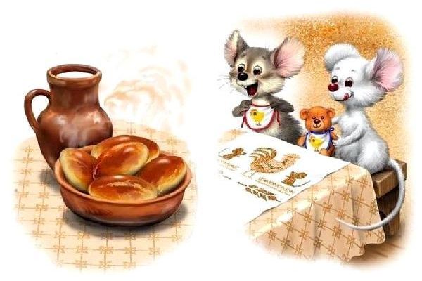 Испеклись пироги, петушок их вынул, выложил на стол, а мышата тут как тут. И звать их не пришлось.