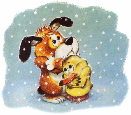 Щенок Тявка и утёнок Крячик смотрели, как на дворе кружатся снежинки, и ёжились от мороза.