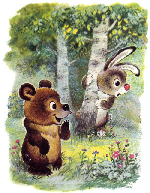 — А ты… совсем не розовый, а… серый… — заметил Медвежонок, взглянув на Зайчонка.