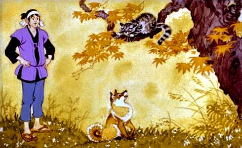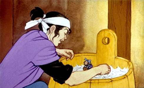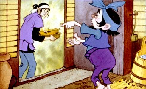 Пришлось Таро спать под открытым небом. Чуть свет ушёл он со двора подальше. А вскоре соседки у колодца поспорили, чей ребёнок в драке виноват. Ну как тут не послушать!