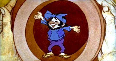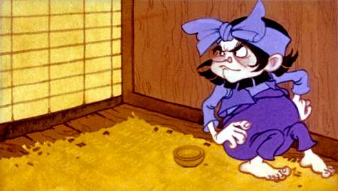 Заглянул Таро в кувшин — и что же видит? Не мышь там прячется, не ящерица, не лягушка, а маленький человечек. Головёнка у него ну не больше каштана, а сам он, если на ноги встанет, будет ростом с гороховый стручок. Вот чудо! Таро так широко рот разинул от удивления, что в него, как в ворота, повозка с конём могла бы въехать.