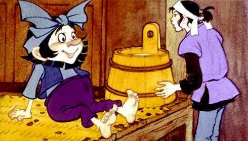 Целый день играл Таро с Кувшинным человечком. Посадил его в деревянную чашку и катал в кадке с водой. Подует посильнее — в кадке буря поднимается.