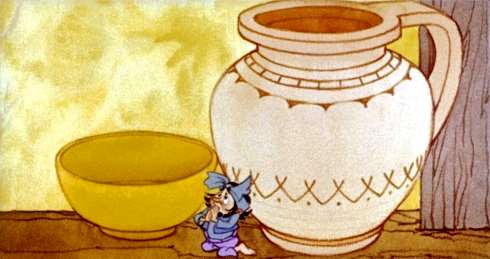 Дома вынул он маленького человечка из кувшина и бережно, двумя пальцами, посадил посреди комнаты. А кошку на улицу выгнал за то, что стала облизываться.