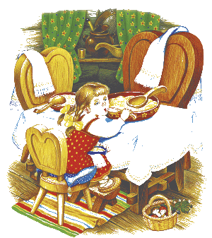 В домике было две комнаты: одна столовая, другая спальня. Девочка вошла в столовую и увидела на столе три чашки с похлёбкой. Первая чашка, очень большая, была Михайлы Иваныча. Вторая чашка, поменьше, была Настасьи Петровнина; третья, синенькая чашечка, была Мишуткина. Подле каждой чашки лежала ложка: большая, средняя и маленькая.