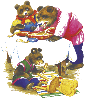 В домике этом жили три медведя. Один медведь был отец, звали его Михайло Иванович. Он был большой и лохматый. Другой была медведица. Она была поменьше, и звали её Настасья Петровна. Третий был маленький медвежонок, и звали его Мишутка. Медведей не было дома – они ушли гулять по лесу.