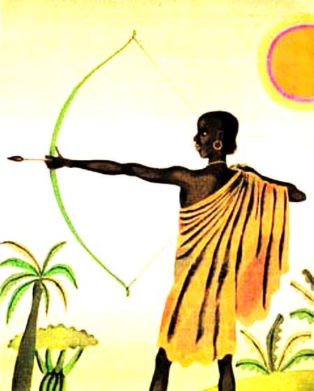 — Перенеси на тот берег, — говорит, и в тот же миг очутились они на том берегу.чернокожий лучник Сампа стреляет из лука