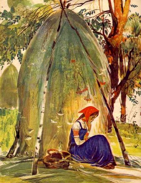 Залилась Алёнушка слезами, села под стожок — плачет, а козлёночек возле неё скачет.