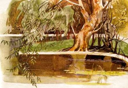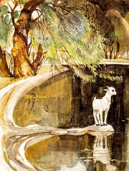 Одному козлёночку всё было ведомо. Повесил он голову, не пьёт, не ест. Утром и вечером ходит по бережку около воды и зовёт: