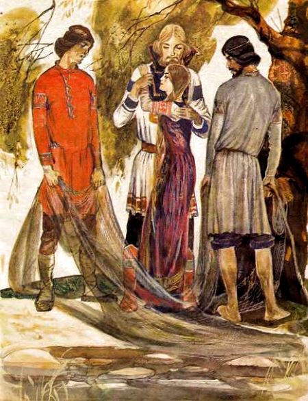 Слуга побежал домой и рассказал купцу про то, что слышал на речке. Собрали народ, пошли на реку, закинули сети шёлковые и вытащили Алёнушку на берег. Сняли камень с шеи, окунули её в ключевую воду, одели её в нарядное платье. Алёнушка ожила и стала краше, чем была.