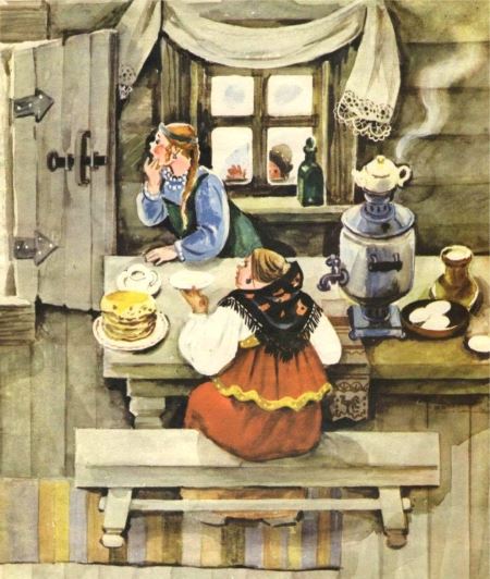Запрягай скорее, старый хрыч, поезжай за дочерью, привези ее в злате-серебре… Старик уехал. А собачка под столом:
