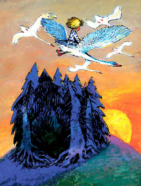 Налетели гуси–лебеди, подхватили мальчика, унесли на крыльях.
