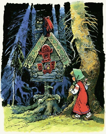 Вдруг видит — стоит избушка на курьей ножке, об одном окошке, кругом себя поворачивается.