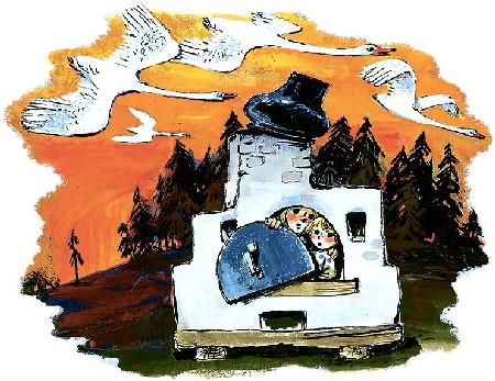 — Печка, печка, скажи, куда гуси–лебеди полетели?