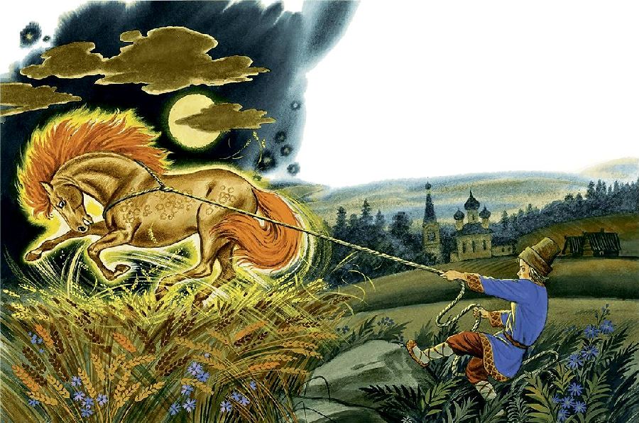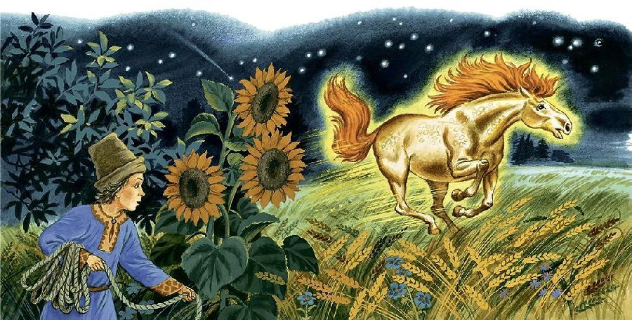 В самую полночь прискакал на пшеницу разношёрстный конь: одна шерстинка золотая, другая серебряная; бежит — земля дрожит, из ушей дым столбом валит, из ноздрей пламя пышет. И стал тот конь пшеницу есть: не столько ест, сколько топчет.