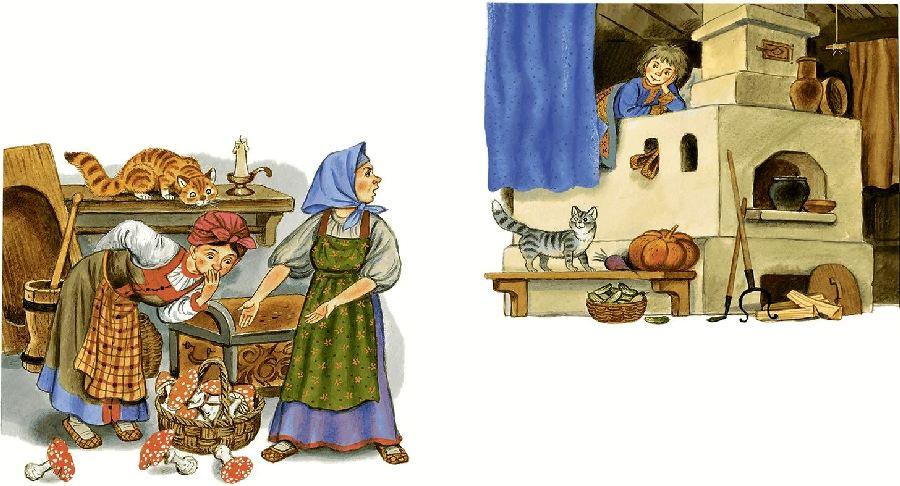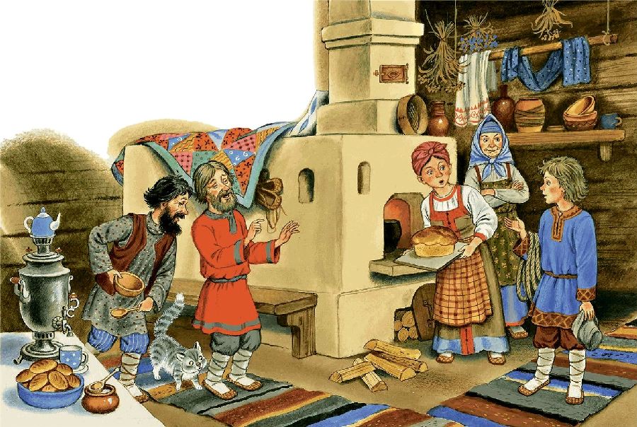 Приходят братья домой, а Иванушка уже на печи лежит, слушает, что братья рассказывают, и посмеивается.