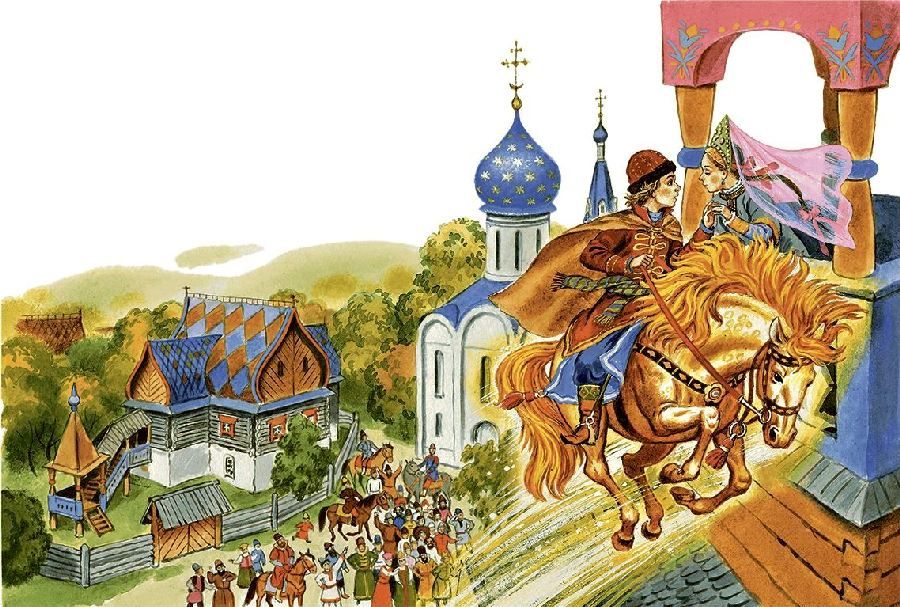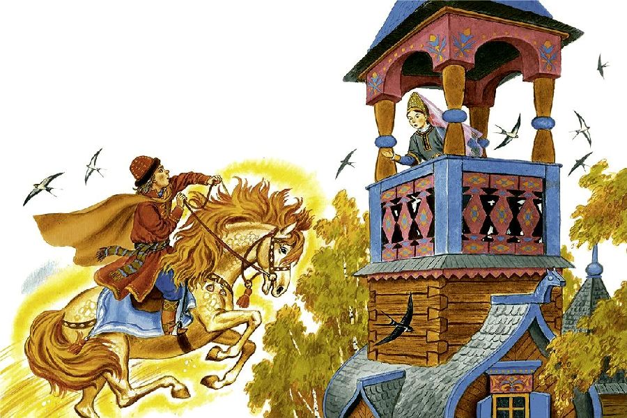 Скоро после этого стали по деревням и городам бирючи[2] от царя ходить, клич кликать: собирайтесь–де, бояре и дворяне, купцы и мещане, и простые крестьяне, все к царю на праздник, на три дня; берите с собой лучших коней; и кто на своём коне до царевнина терема доскочит и с царевниной руки перстень снимет, за того царь царевну замуж отдаст.