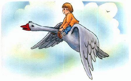 Сжалился защипанный гусёнок, посадил Терёшечку на крылья, встрепенулся и полетел, понёс его домой.