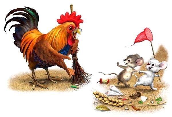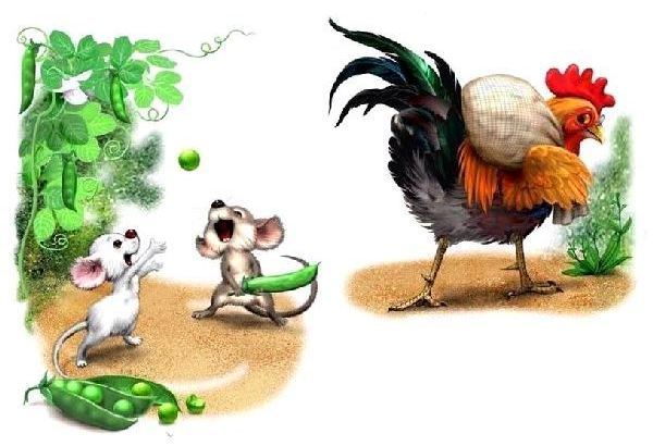 Мышата только и знали, что пели да плясали, крутились да вертелись. А петушок чуть свет поднимался, сперва всех песней будил, а потом принимался за работу.