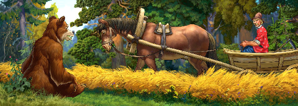 Собрали они рожь. Отдал мужик медведю корешки, а рожь наклал на воз и увёз домой.