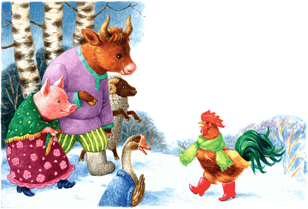 А бык, баран, гусь да петух и свинья живут там, поживают и горя не знают.