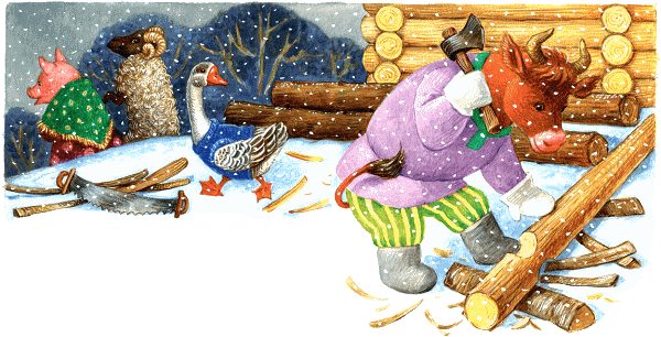 Услышал это бык и убежал в лес. Летом в лесу привольно. Живут беглецы — горя не знают. Но прошло лето, пришла и зима.