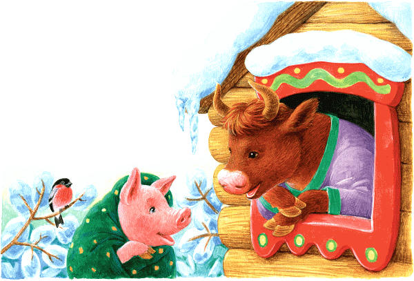 — Хрю! Хрю! Пусти меня, бык, погреться!