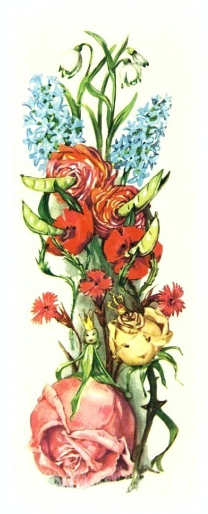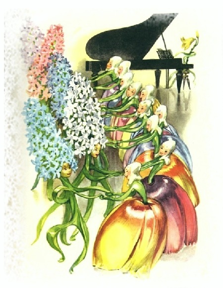 Гиацинты и крокусы изображают маленьких морских кадетов и танцуют с барышнями — голубыми фиалками, а тюльпаны и большие жёлтые лилии — это пожилые дамы, они наблюдают за танцами и вообще за порядком.