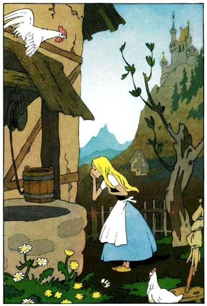 Однажды сидела она так, пряла и запачкала кровью веретено. Наклонилась девушка к колодцу,чтобы обмыть веретено, и вдруг выскользнуло у нее веретено из рук и упало в колодец.