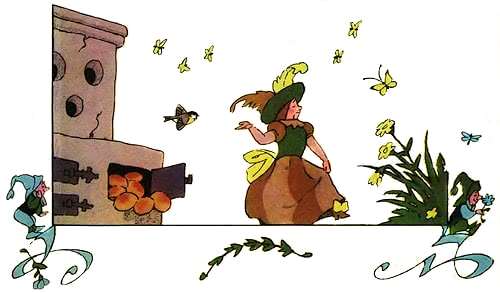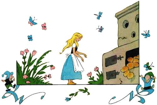 И вот очутилась она на той же самой зеленой лужайке, где росли красивые цветы. Пошла она по тропинке и скоро пришла к печи. где пеклись хлебы.