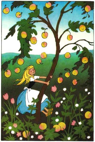 Взяла девушка лопату и вынула хлебы из печи. Потом пошла она дальше и пришла к яблоне. А на яблоне было много спелых яблок.