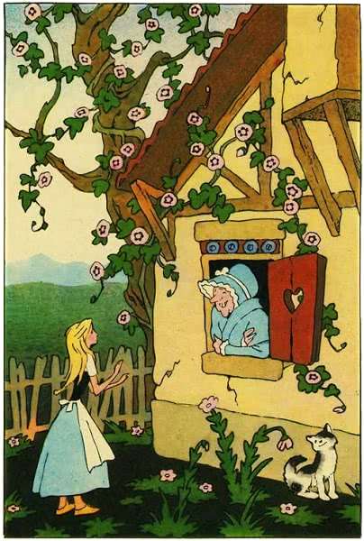 Наконец подошла лентяйка к дому госпожи Метелицы. Она совсем не испугалась Метелицы. Ведь сестра рассказала ей о больших зубах Метелицы и о том, что она совсем не страшная.