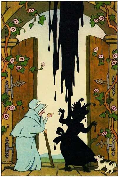 Подвела ее Метелица к большим воротам. Распахнулись ворота. Но когда выходила из них лентяйка, не золото на нее посыпалось, а опрокинулся котел со смолой.