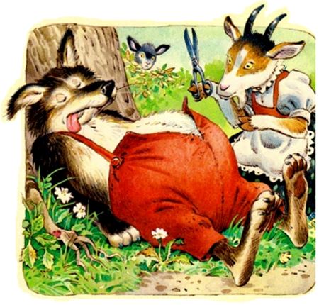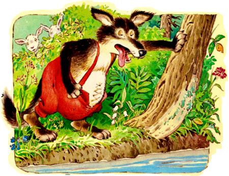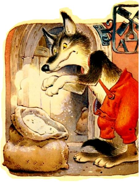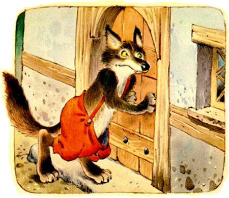 Пошел тогда волк к купцу и купил себе мела большой кусок, съел его, и стал у него голос тонкий. Вернулся назад, постучался в дверь и говорит: