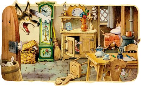 Испугались они и решили спрятаться. Прыгнул один козленочек под стол, другой — на кровать, третий — на печку, четвертый — в кухню, пятый — в шкаф, шестой — под умывальник, а седьмой — в футляр от стенных часов. Но всех их нашел волк и не стал долго разбираться: разинул пасть и проглотил их одного за другим; одного только он не нашел, того младшего, что спрятался в часах.