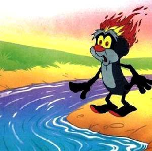 Перекинулась соломинка с берега на берег, и первым побежал по ней уголёк. Бежит, как по мосту. Добежал до середины, слышит — плещет внизу вода. Стало ему страшно, остановился он и кричит: