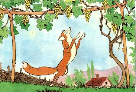 6. Самим автором своя стихотворная басня отнесена к «переводам или подражаниям». За её основу И.А.Крылов взял прозаическую историю древнегреческого поэта Эзопа об алчной и несамостоятельной лисице, которая видит в саду гроздья винограда и старается допрыгнуть до них и съесть. Но, увы, у торопливой лисицы ничего не получается. Русский баснописец разнообразил эзоповский поучительный рассказ стройным слогом, острым юмором, лаконичностью и точностью языка.