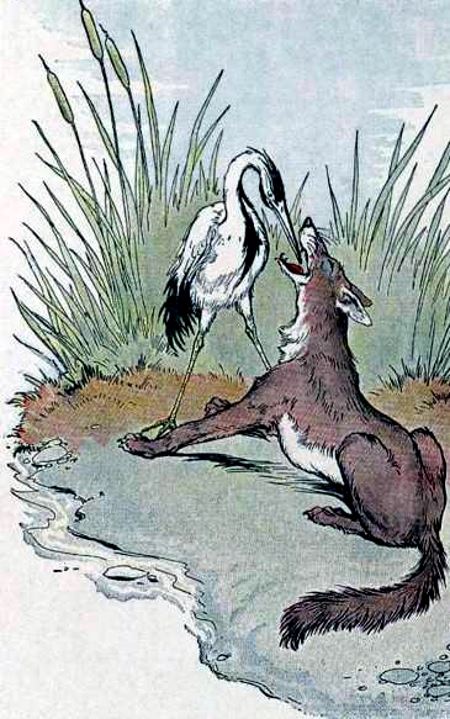 Басня была отнесена И.А.Крыловым к числу «переводов или подражаний» и представляет собой обработку басни Лафонтена «Волк и Аист», которая в свою очередь восходящей к басням Эзопа и Федра («Волк и Цапля»).