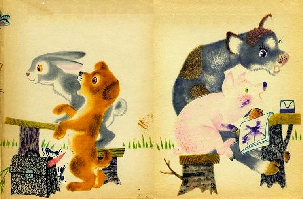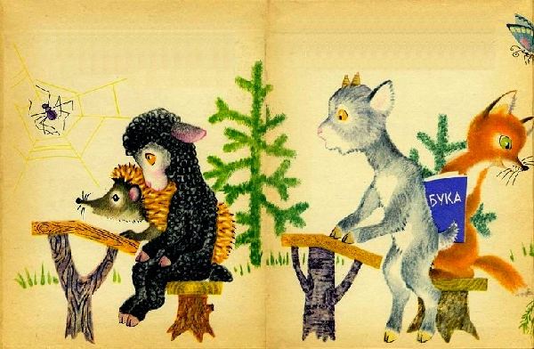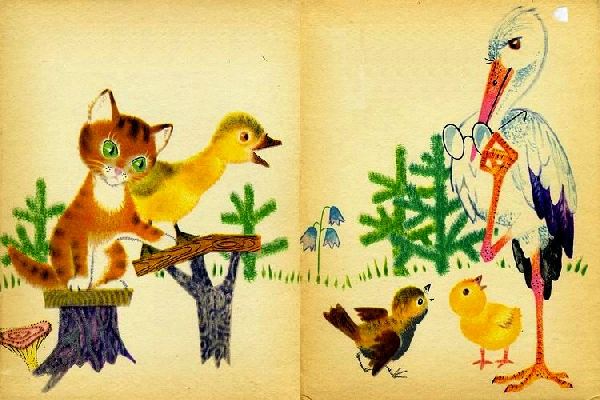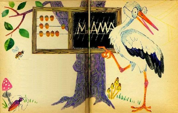 — Ну ладно, — сказал учёный аист, подумал и поставил всем зверюшкам пятёрки. Потому что каждый из них правильно сказал слово «МАМА», но только на своём языке.