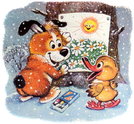 Щенок Тявка и утёнок Крячик смотрели, как на дворе кружатся снежинки, и ёжились от мороза.