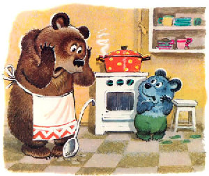 Когда Медвежонок заглянул в свою берлогу, то мама Медведица, которая варила обед, даже поварежку от испуга на пол уронила.