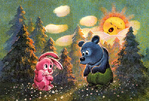 — А ты… совсем не розовый, а… серый… — заметил Медвежонок, взглянув на Зайчонка.