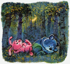— А ты тоже… до чего же… зелёно-синий… Ну, просто совсем… сине-зелёненький! — похвалил Зайчонок и погладил Медвежонка по спине.