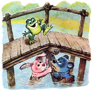 Утром Зайчонок с Медвежонком проснулись и побежали к ручью умываться. Видят: мостик через ручей сломан.