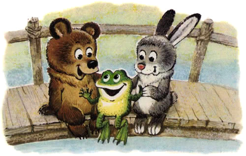 Высунул из кустов мордочку Медвежонок — и тоже заковылял к лягушонку.