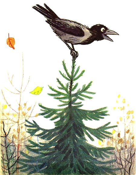 Смотрит Заяц — на ёлке сидит Ворона и смеётся.