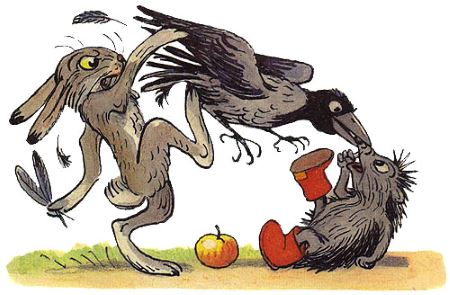 Крик, шум на весь лес. И уже драка начинается: Ворона Ежа в нос клюнула, Ёж Зайца иголками уколол, а Заяц Ворону ногой лягнул…